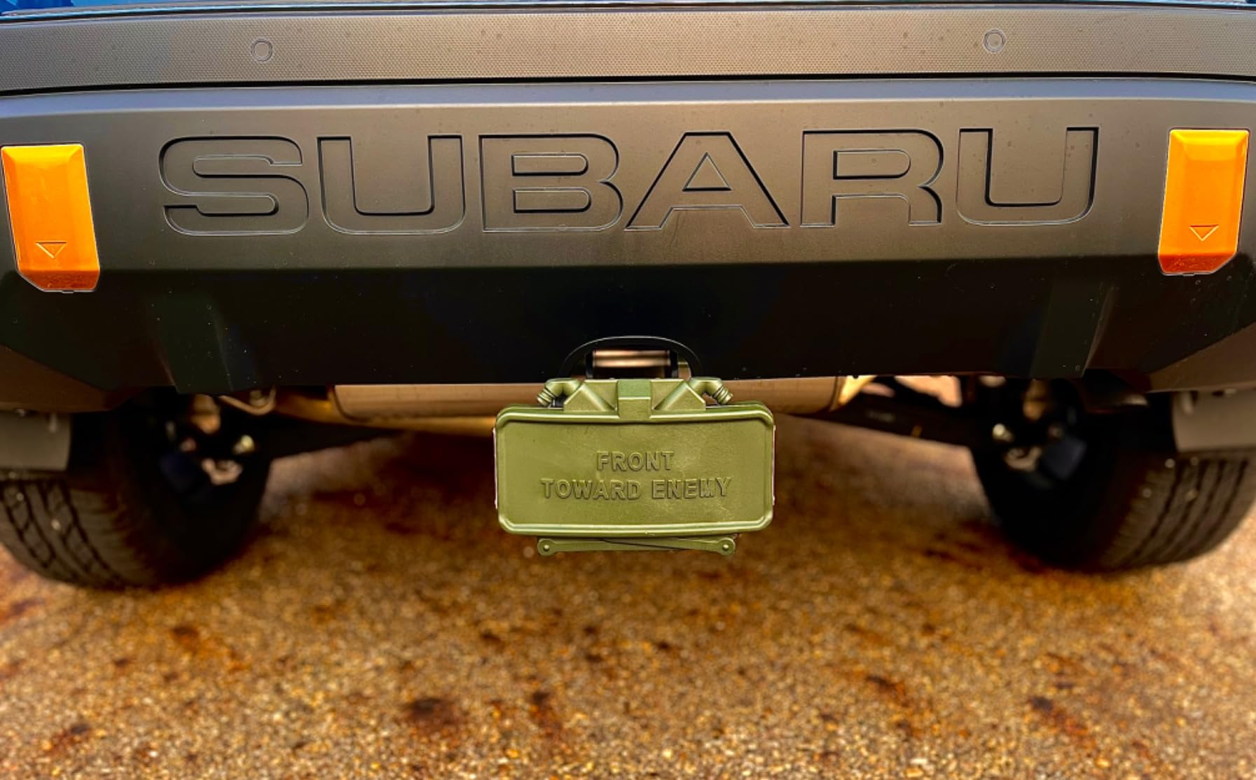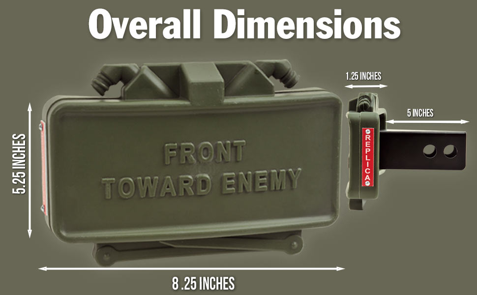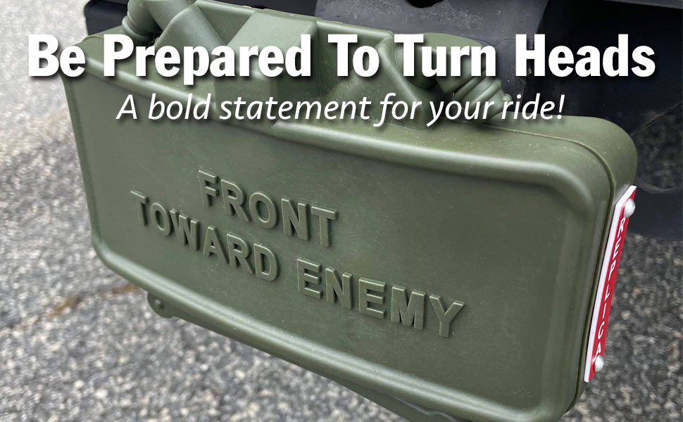 This realistic looking (inert) military claymore mine hitch cover is the perfect addition to your vehicle! Anyone who tailgates and knows what it is might think twice before getting too close to your vehicle!